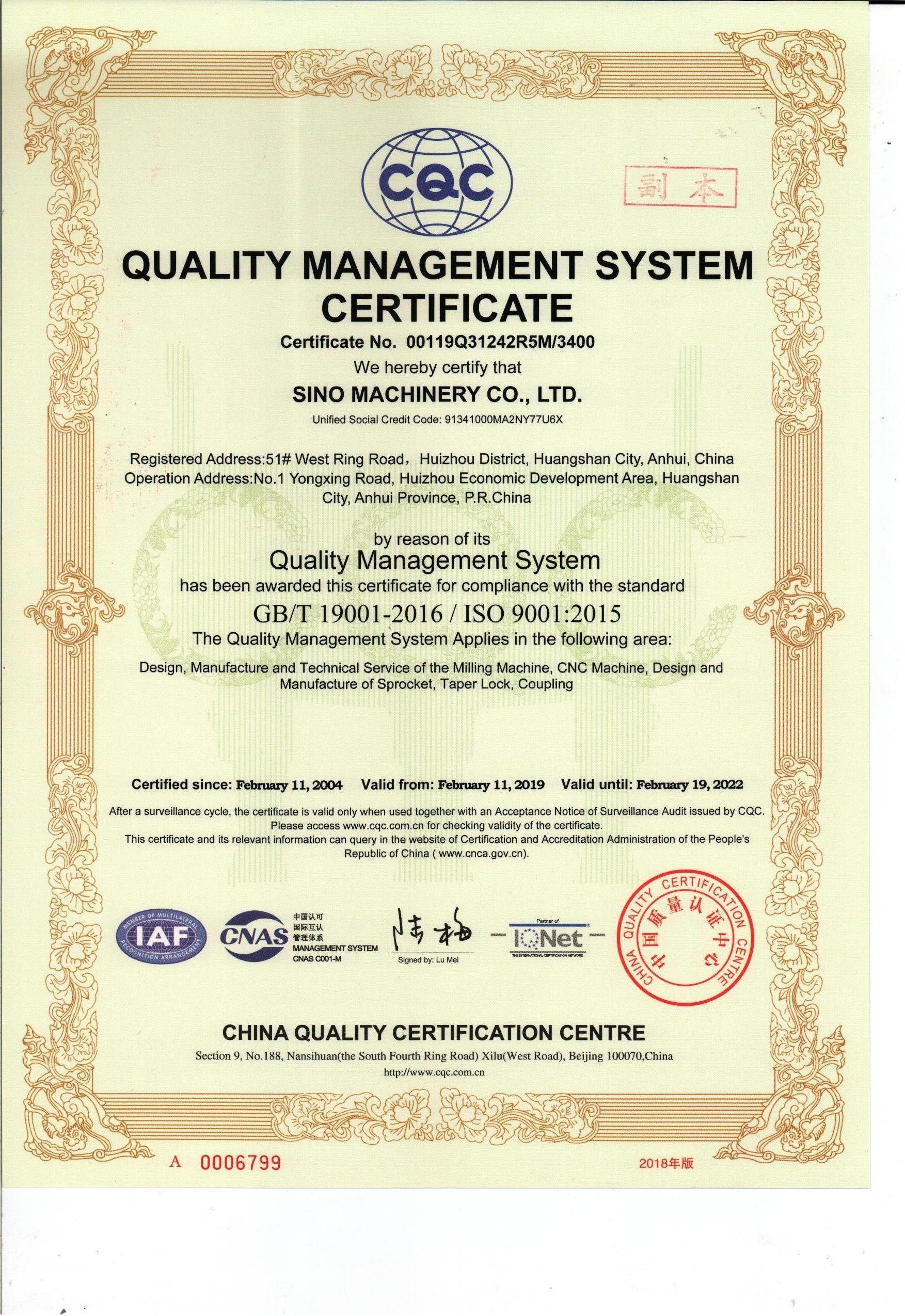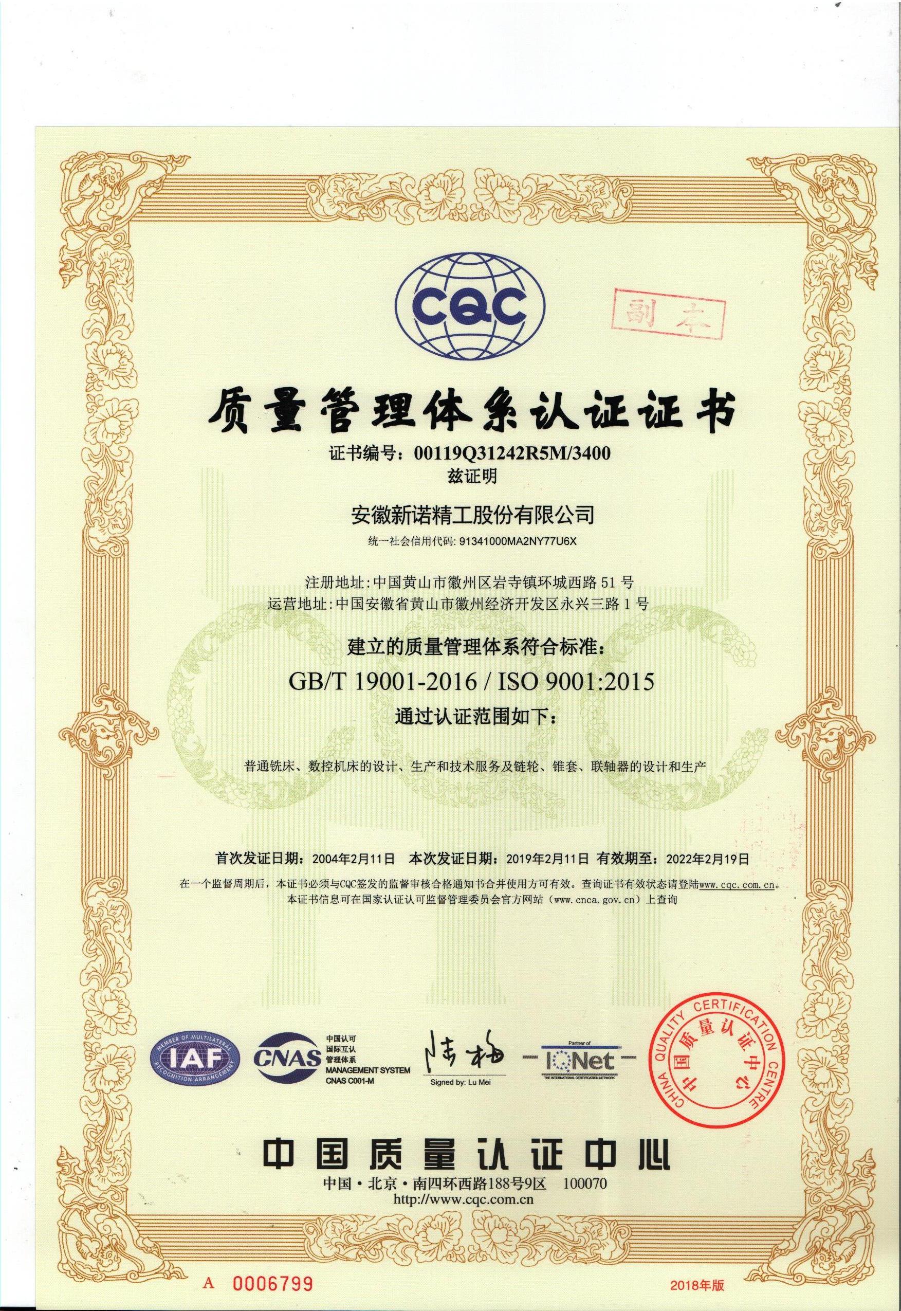質(zhì)量管理體系認(rèn)證證書(中文)