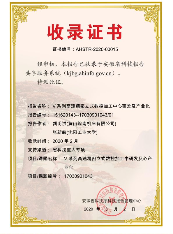 項目證書-V系列高速精密立式數(shù)控加工中心研發(fā)及產(chǎn)業(yè)化