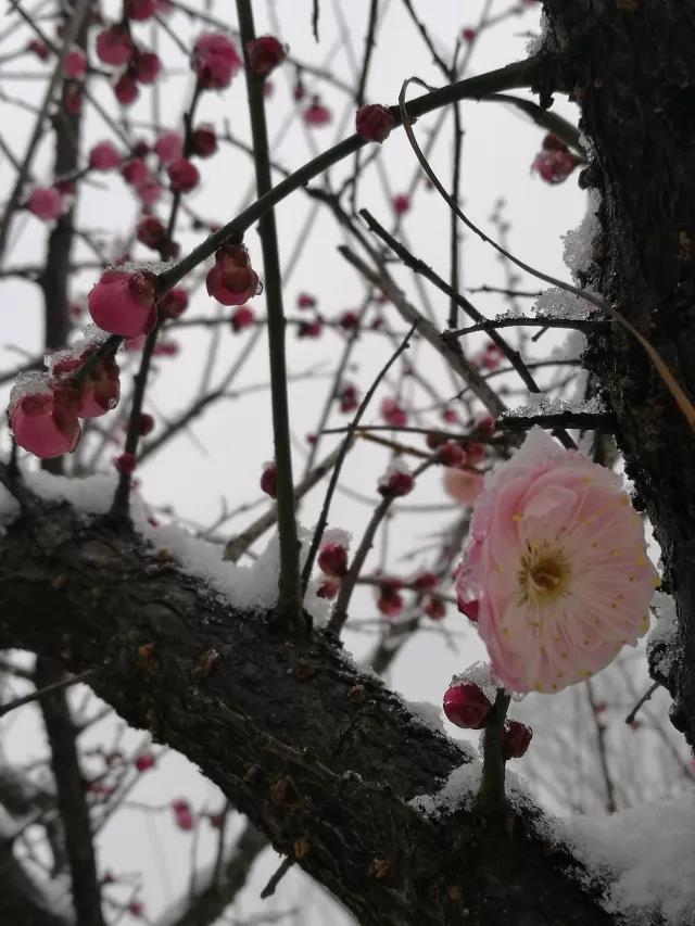 花園里梅枝疏影傾斜,與雪共舞。