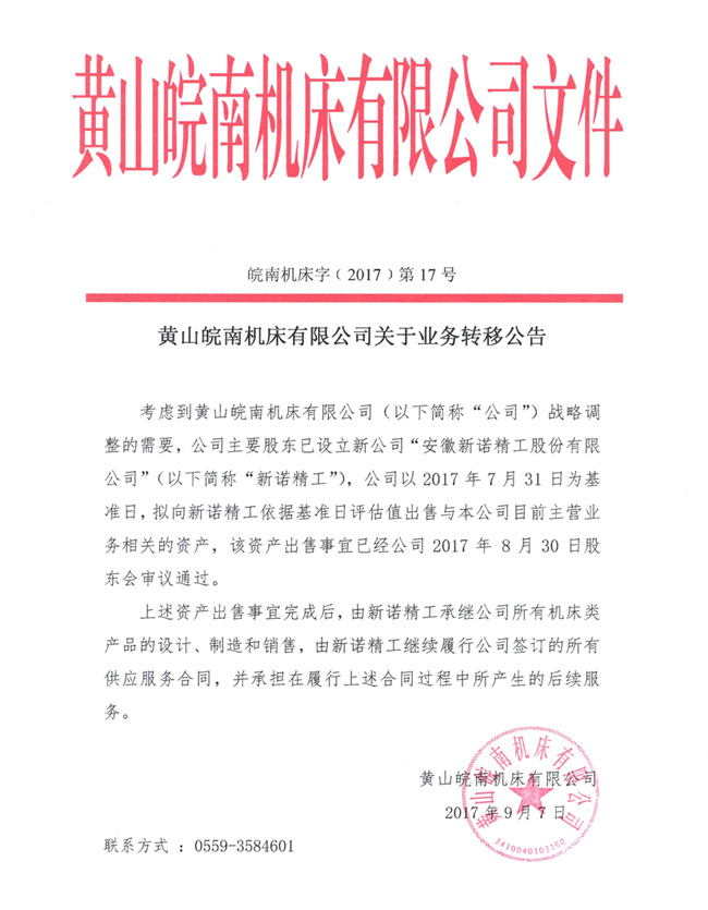 考慮到黃山皖南機(jī)床有限公司(以下簡稱“公司”)戰(zhàn)略調(diào)整的需要,公司主要股東已設(shè)立新公司“安徽新諾精工股份有限公司”(以下簡稱“新諾精工”),公司以2017年7月31日為基準(zhǔn)日,擬向新諾精工依據(jù)基準(zhǔn)日評估值出售與本公司目前主營業(yè)務(wù)相關(guān)的資產(chǎn),該資產(chǎn)出售事宜已經(jīng)公司2017年8月30日股東會審議通過。