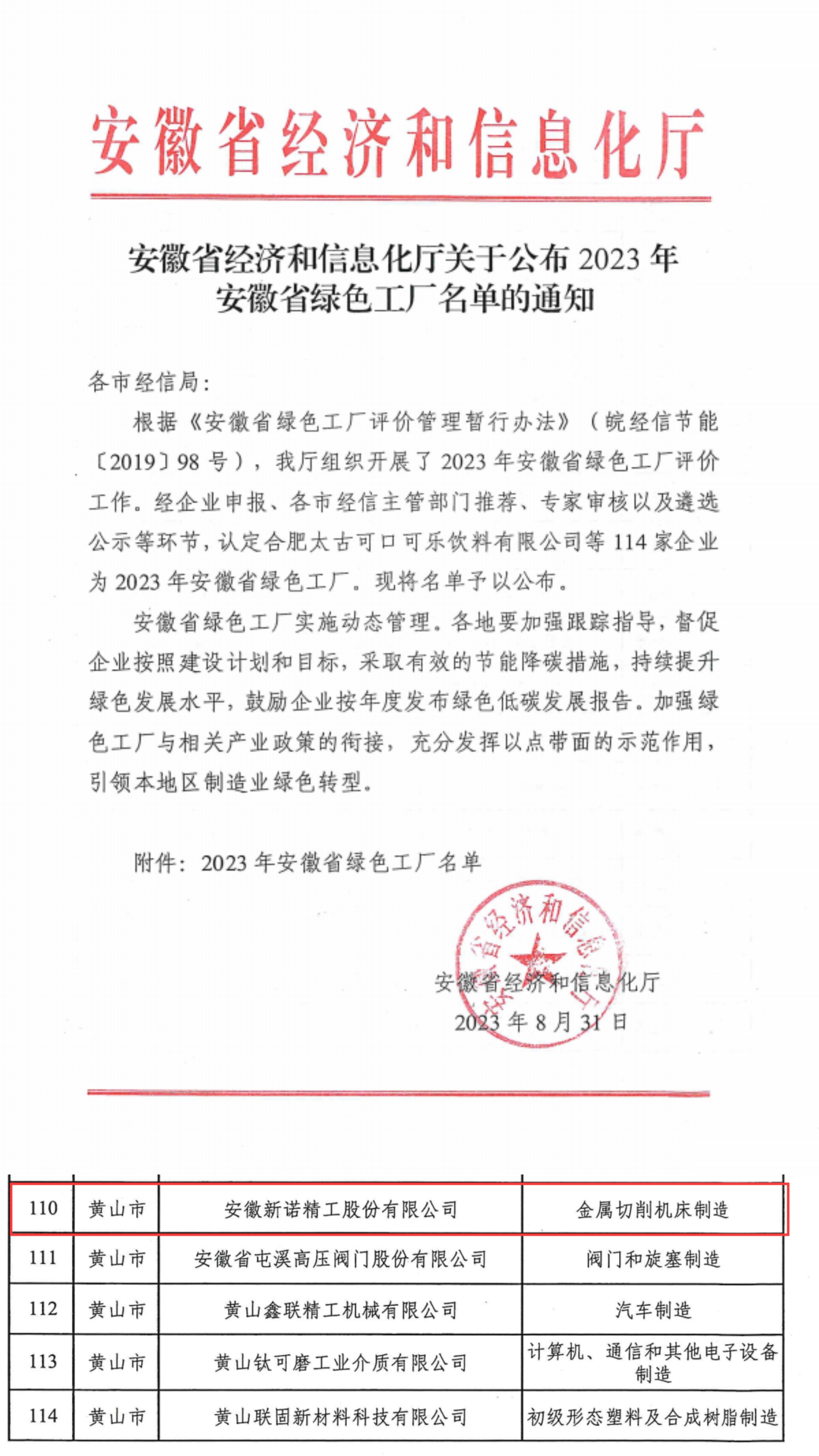 根據(jù)《安徽省綠色工廠評價管理暫行辦法》(皖經(jīng)信節(jié)能〔2019〕98號)、《安徽省經(jīng)濟和信息化廳關于做好2023年省級綠色工廠推薦和復審工作的通知》有關要求,經(jīng)公司申報、黃山市經(jīng)濟和信息化主管部門審核推薦、省廳初審、專家評審、公示等程序,安徽新諾精工股份有限公司被評為2023年安徽省綠色工廠。